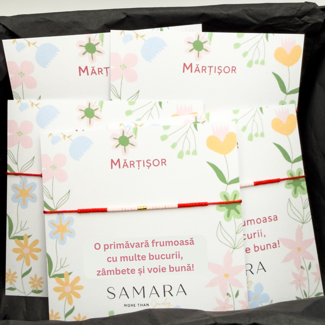 Pentru aceste pachete de mărțișor, brățările sunt livrate pe cartonașe dedicate de sezon.